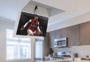 Существуют также моторизованные потолочные кронштейны. Этот вариант считается наиболее удобным, поскольку положение телевизора можно будет менять, не вставая с кровати или дивана.