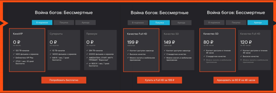 Можно купить контент навсегда, взять в аренду или смотреть любимый контент в подписке.