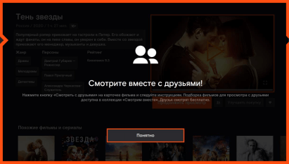 При первом заходе на карточку VOD доступного к совместному просмотру, пользователю отображается информационный экран