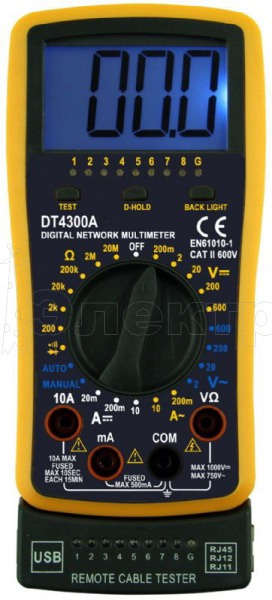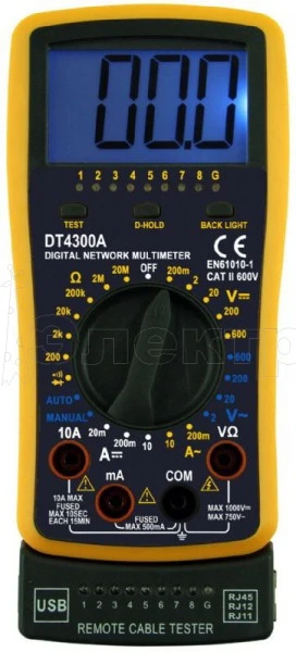 Характеристики: Постоянное напряжение: 200mВ/2В (±0,8%+3), 20В/200В (±0,8%+5), 600В (±1%+5) Переменное напряжение: 2В/600В (±1.2%+3) Постоянный ток: 200мкА/2мА/20мА (±1,0%+2), 200мА(±2,0%+2), 10A (±2,0%+10) Переменный ток: 200мА (±1,0%+5) / 10А (±3,0%+5) Сопротивление: 200Ом (±1,5%+3), 2КОм/20КОм/200КОм/2МОм (±1,5%+3) Тестирование диодов Прозвонка целостности цепи Прозвонка кабеля: RJ11/RJ12/RJ45/USB Режим "DATA HOLD" Подсветка дисплея 3,5х разрядный дисплей Размер (мм): 170*85*33мм Тип батареи: Rexant 9В Крона (в комплекте) Противоударный чехол в комплекте