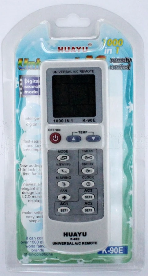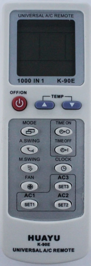 Универсальный пульт ДУ для кондиционеров К-90Е позволяет управлять большинством Китайских и Европейских кондиционеров и сплит систем. В его базе содержится более тысячи кодировок под различные модели техники. Данный пульт очень прост в настройке, обладает оригинальным внешним видом и большим жк дисплеем. Индикация операций и встроеный таймер включения/выключения делают данный пульт удобным в использовании. Данный пульт обладает тремя кнопками SET что позволяет настроить его под три кондиционера одновременно.