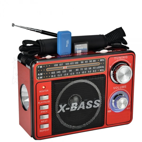 FM: 88-108 MHz AM: 530-1600 KHz SW: 8.0-16 MHz Фонарик 1Led Разъёмы: USB, AUX 3.5mm, TF(до 32Гб), SD(до 32Гб), 3.5mm для наушников Питание: аккумулятор встроенный (зарядка 3V) / 220V шнур в комплекте (ТОЛЬКО ДЛЯ ЗАРЯДКИ АККУМУЛЯТОРА) / 2*R20 (в комплект не входят) Гнездо 5.5mm 4.5B для заряда аккумулятора Размер: 17 х 12 х 7 см