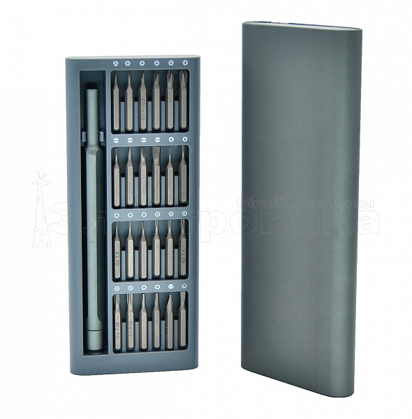 24 намагниченные биты: Насадка звезда с отверстием T6H, насадка звезда с отверстием T8H, насадка звезда с отверстием T10H, насадка звезда с отверстием T15H, насадка треугольная 2.3, насадка Y 1, насадка звезда T4, насадка звезда T2, насадка звезда T3, насадка U 2.6, насадка звезда Pentalobe 2.0, насадка звезда Pentalobe 5.0, насадка звезда с отверстием T5H, насадка крестовая PH 2, насадка плоская SL 4.0, насадка плоская SL 2.0, насадка плоская SL 1.5, насадка плоская SL 3.0, насадка крестовая PH 000, насадка крестовая PH 00, насадка крестовая PH 0 , насадка крестовая PH 1, насадка шестигранная H 1.5, насадка шестигранная H 2.0 Алюминиевый кейс с защёлкой
