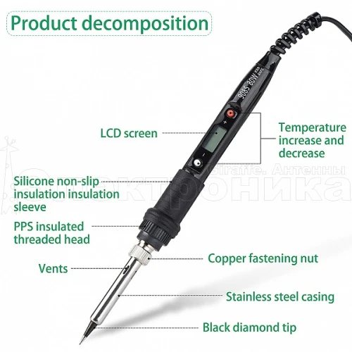 3) Паяльник с терморегулятором: 80Вт / 220В / Диапазон температур: 180 ~ 500℃/356 ~ 932℉ / Наконечники паяльника: 900M-B1.2 / Длина провода: 1,4 м/55,12 дюйма