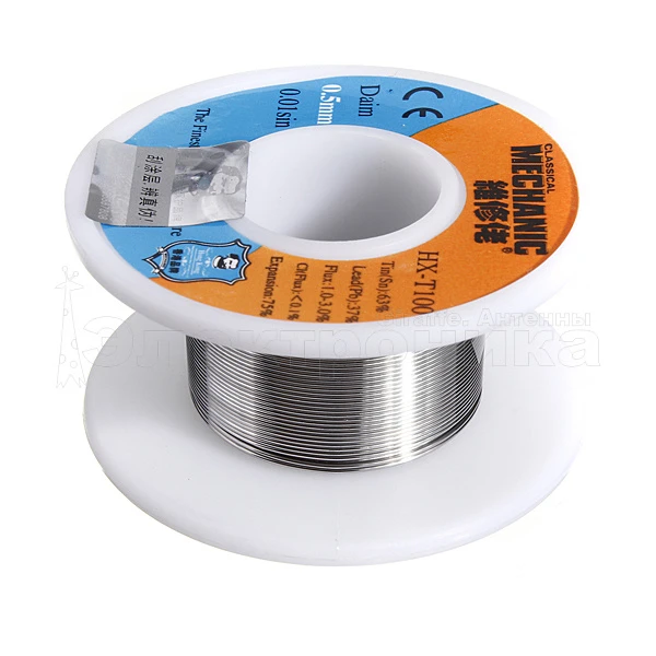 Припой-катушка в проволоке MECHANIC HX-T100 0.5 мм 45г c флюсом Применяется в радиопромышленности для лужения и пайки паяльником электро и радио аппаратуры. Состав: Sn (олово) — 63%, Pb (свинец) — 37%, Флюс 1-3%, Cl (хлор в качестве флюса) — менее 0, 1%. Диаметр припоя составляет 0.5 мм, вес: 45 г., температура плавления: 183 C
